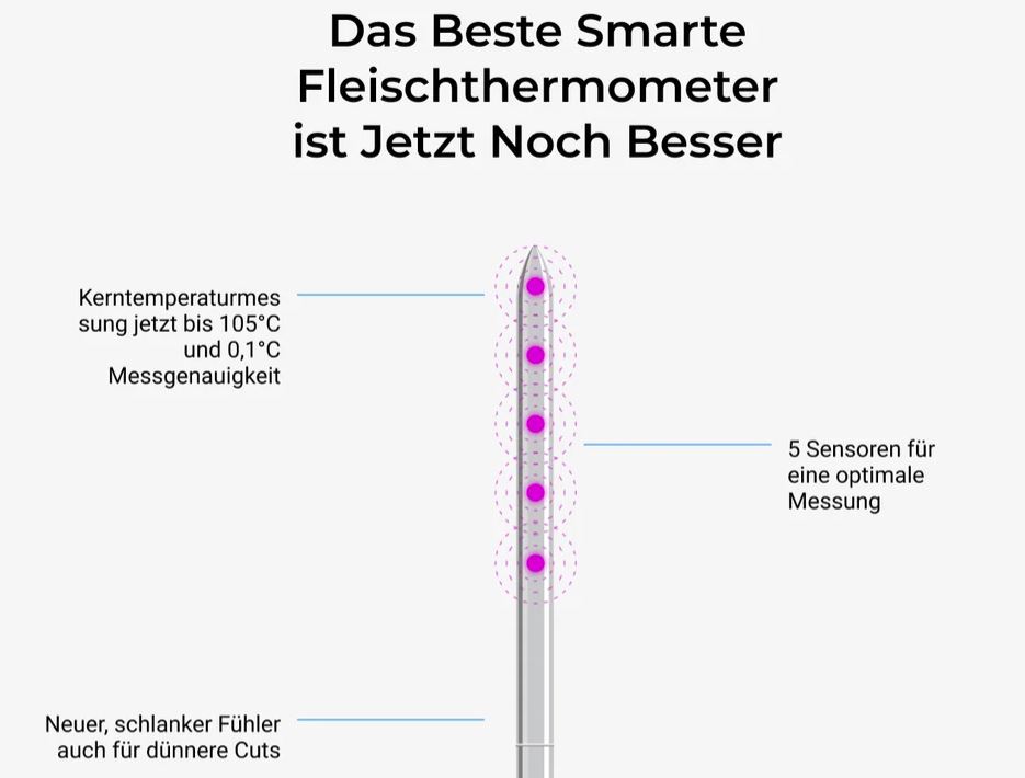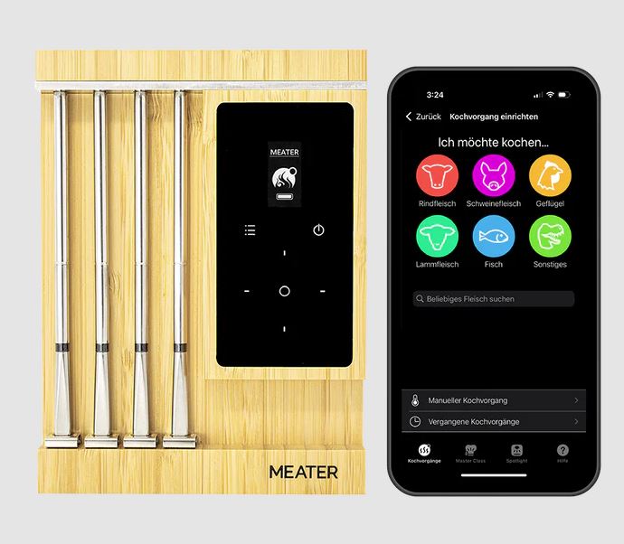 Der MEATER Pro XL ist die neueste Innovation für dein Küchenarsenal! Integriertes WLAN, vier nummerierte Temperaturfühler und Standalone Modus. Koche auf den Punkt für jeden Geschmack und werde zu Hause zum Meisterkoch! Pack die schönen Teller aus, deine Gäste werden begeistert sein. Und kommen garantiert wieder! Perfekt für den Grill. Perfekt in der Küche. Perfekte Ergebnisse. Jedes Mal.