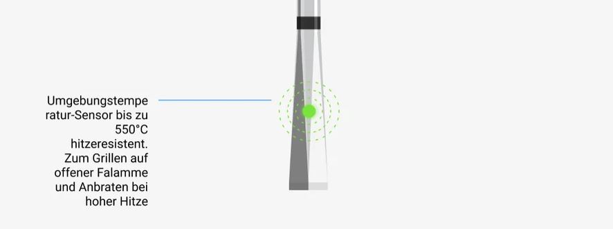 Vier Temperaturfühler: 5 Kerntemperatur-Sensoren und ein Sensor für die Umgebungstemperatur. Höchste Messgenauigkeit der Kerntemperatur bis 105°C und nutzbar bei Umgebungstemperaturen bis 550°C