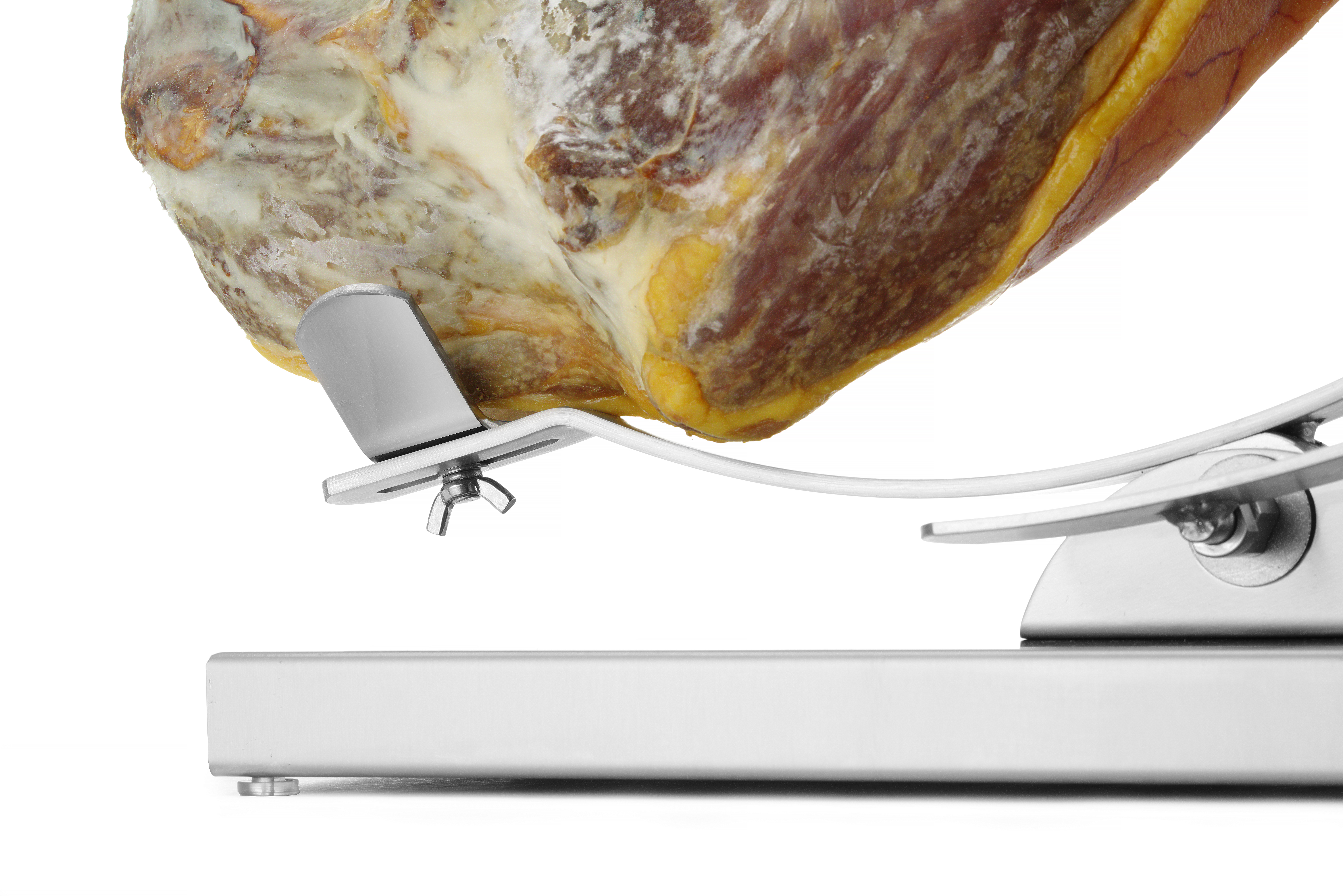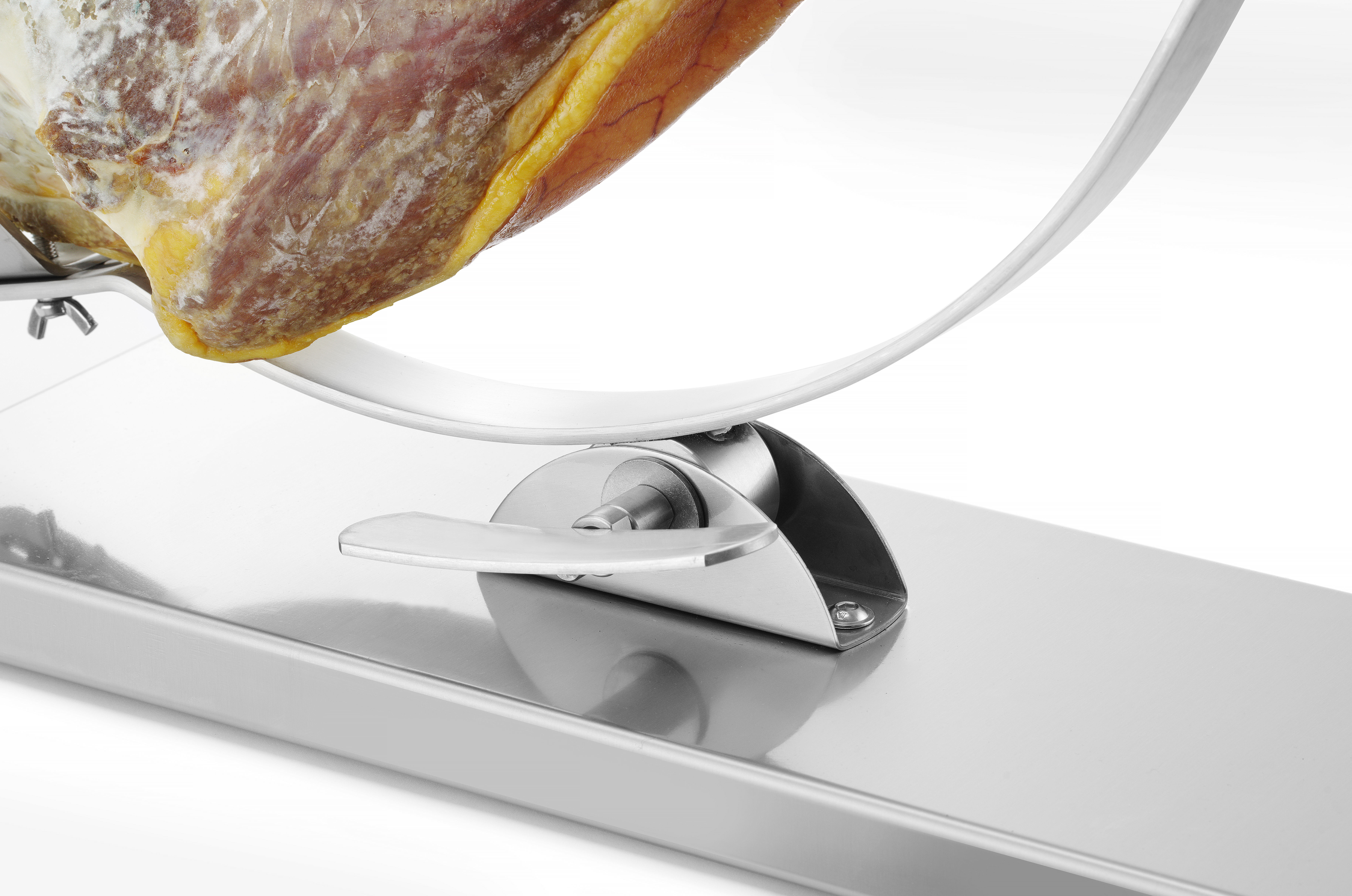 Der Schinken wird mit einer Schraube im Ring befestigt (ø 80 mm). Mit dem Ring kann der Schinken gedreht werden, sodass jedes Fleischstück leicht zugänglich ist.