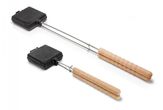Der Griff aus Holz liegt angenehm in der Hand und der Stab sorgt für ausreichend Abstand zur Wärmequelle. Das Gusseisen ist mit einem sogenannten seasoned finish versehen und deswegen sofort einsatzbereit. Zum Reinigen einfach die Gusshälften über das Scharnier voneinander trennen: Auch das gelingt besonders leicht, weil Gusseisen über einen natürlichen Antihafteffekt verfügt.