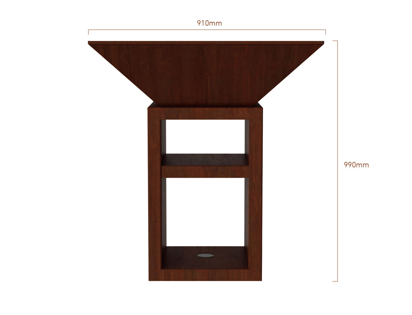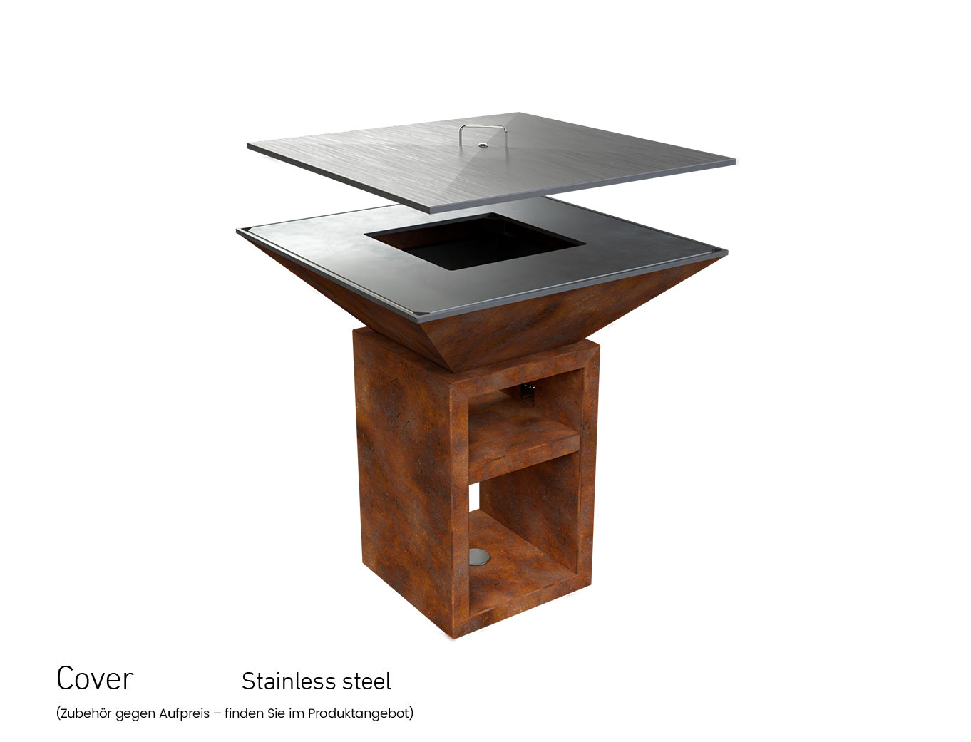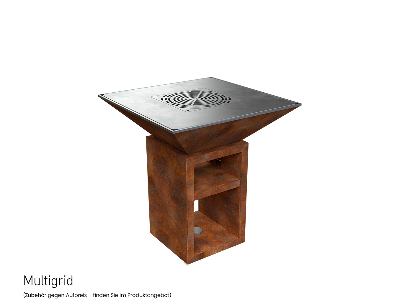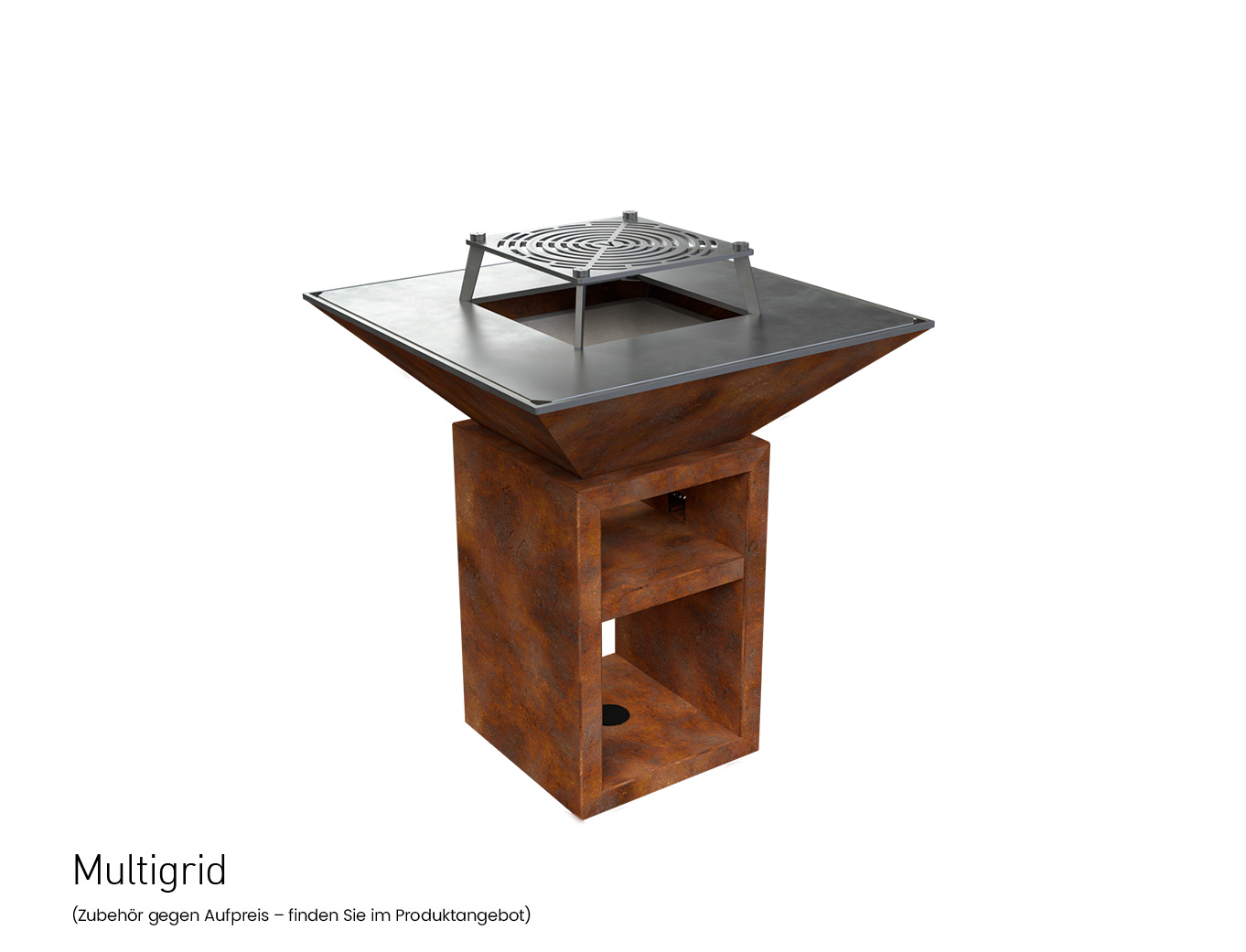 Genießen Sie professionelles Grillen im Stehen. Bestandteil des Vulcanus Pro910 Chef (Grillfläche 910 x 910 mm) ist ein Standfuß, in dem Sie genug Platz für Holz sowie zum Aufbewahren von Geschirr und Lebensmitteln haben.