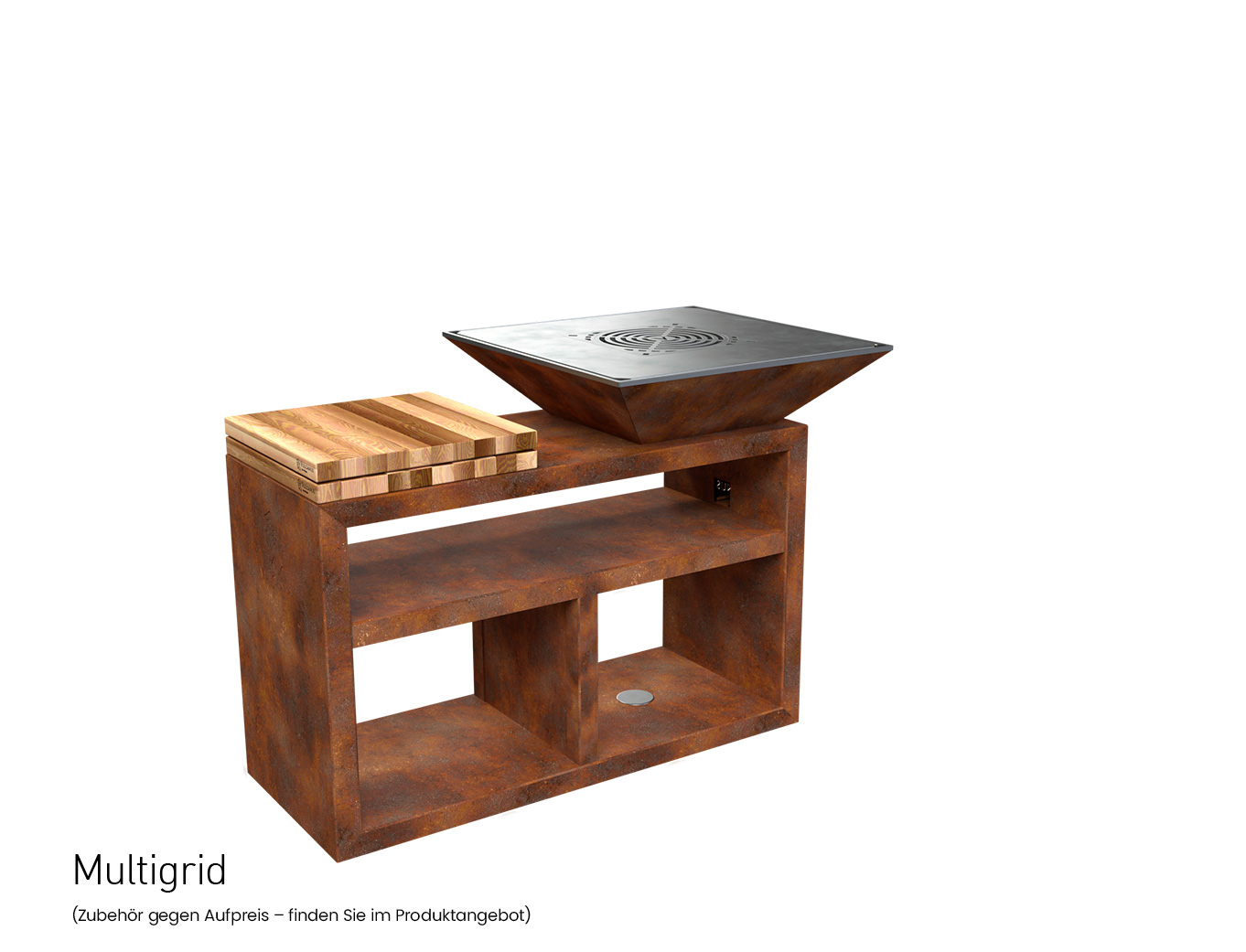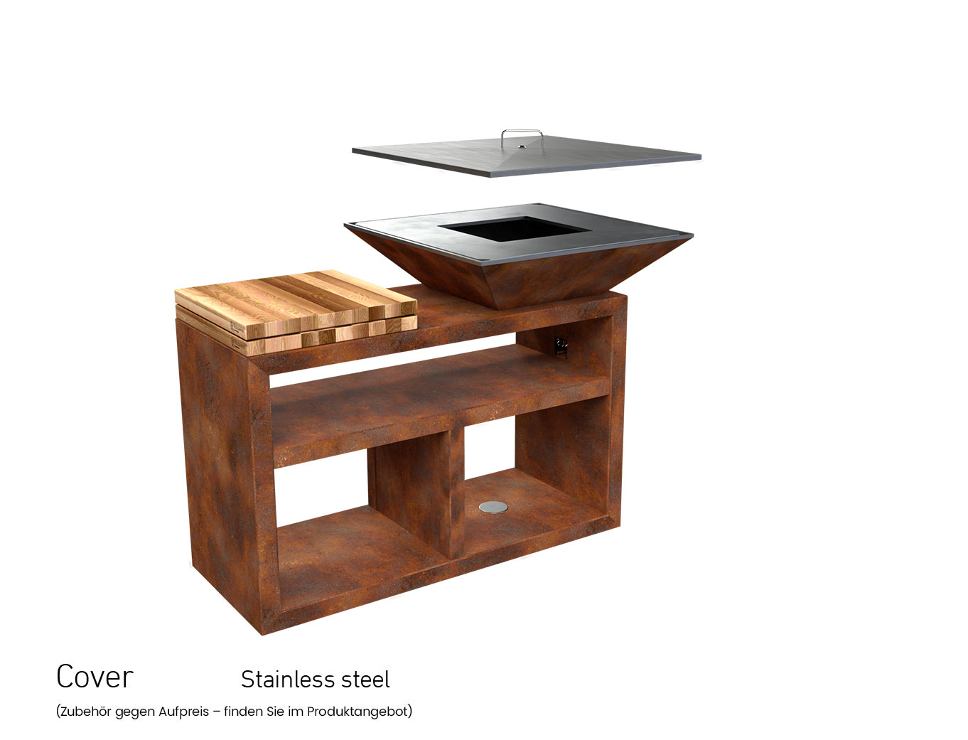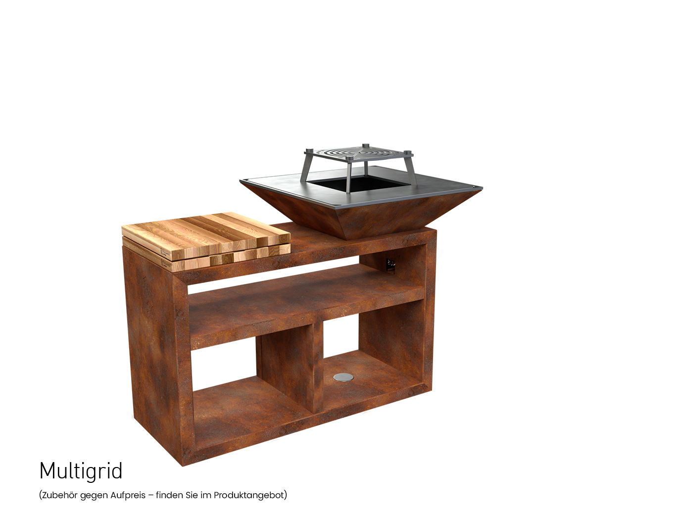 Der große und speziell verlängerte Sockel bietet einen größeren Holzvorratsbehälter, mehr Platz zum Abstellen von Geschirr und einen professionellen Metzgerblock. Bereiten Sie Speisen zu, und servieren Sie sie bequem in der Nähe des Grills.