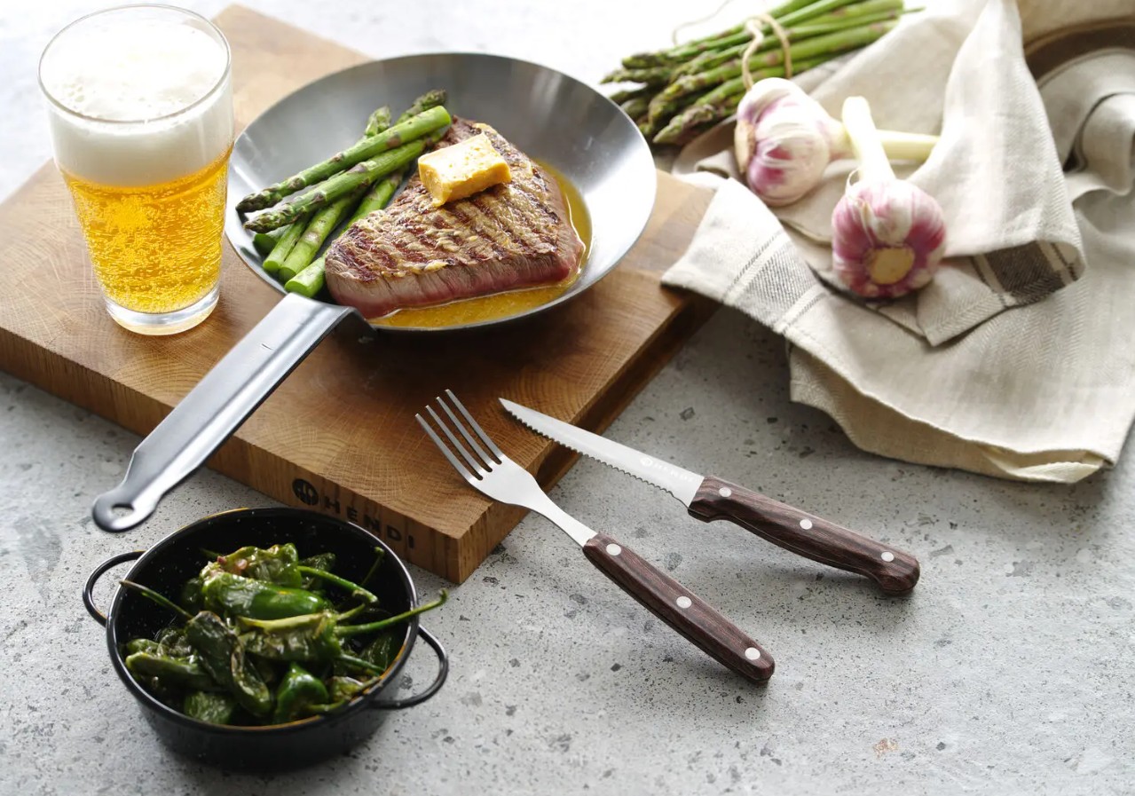 Die HENDI Steakgabel kombiniert langlebigen Edelstahl mit einem komfortablen ABS-Griff und ergänzt das passende Steakmesser für eine abgestimmte Tischdekoration.